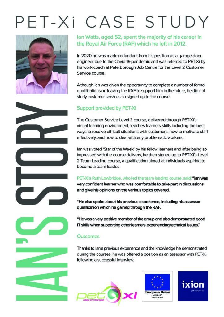 In 2020 he was made redundant from his position as a garage door engineer due to the Covid-19 pandemic and was referred to PET-Xi by his work coach at Peterborough Job Centre for the Level 2 Customer Service course.